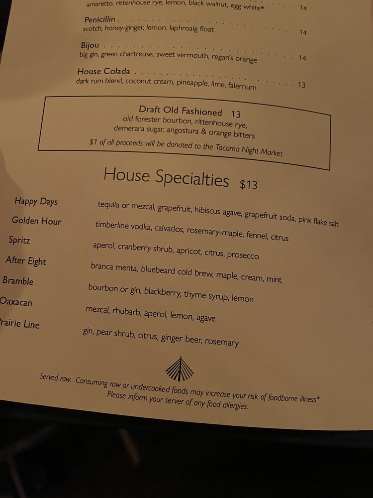 old forester bourbon, rittenhouse rye, demerara sugar, angostura & orange bitters $ of all proceeds will be donated to the multicare health foundation